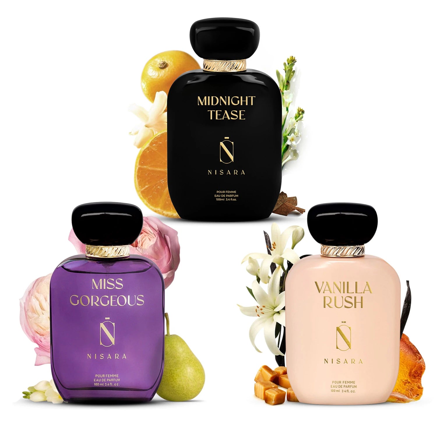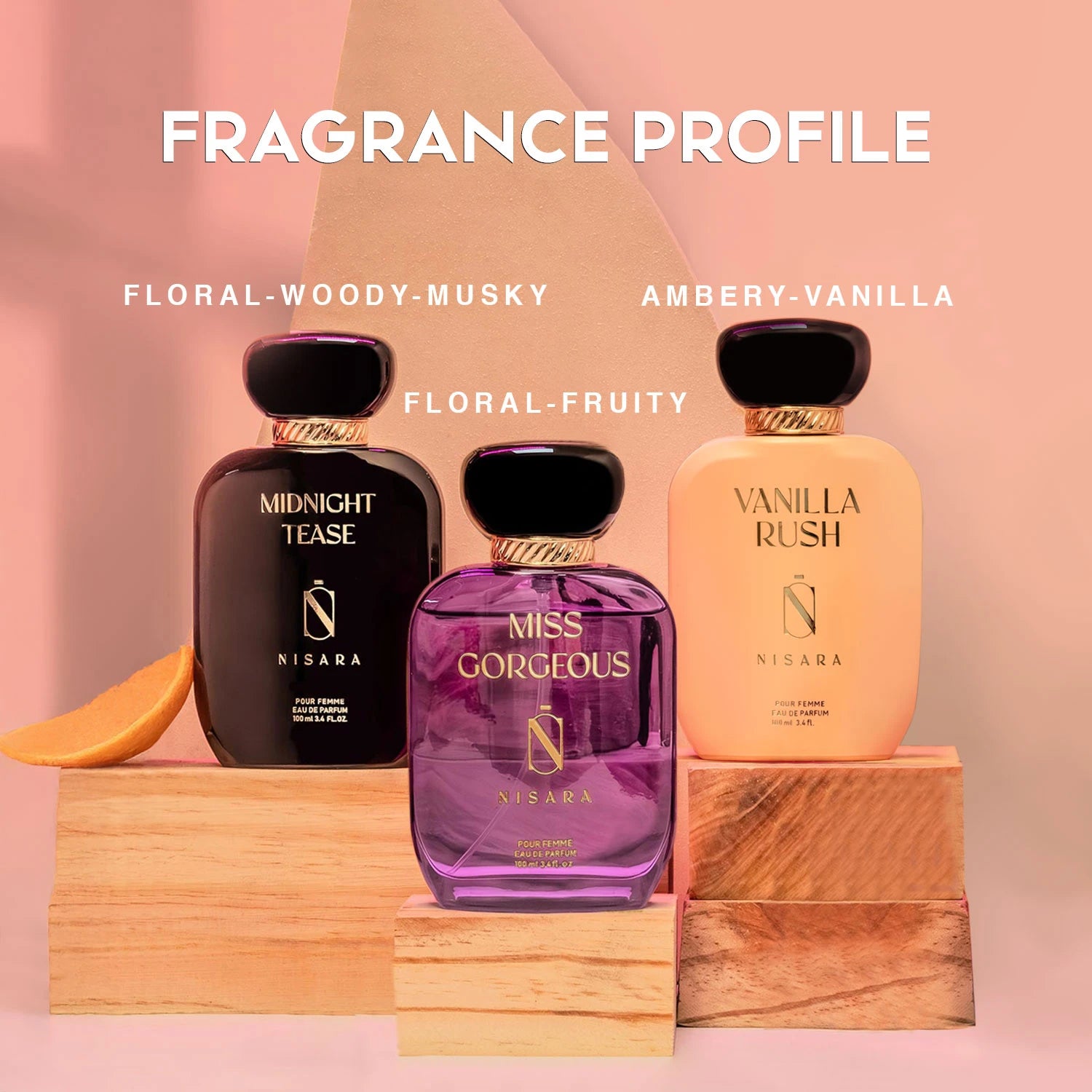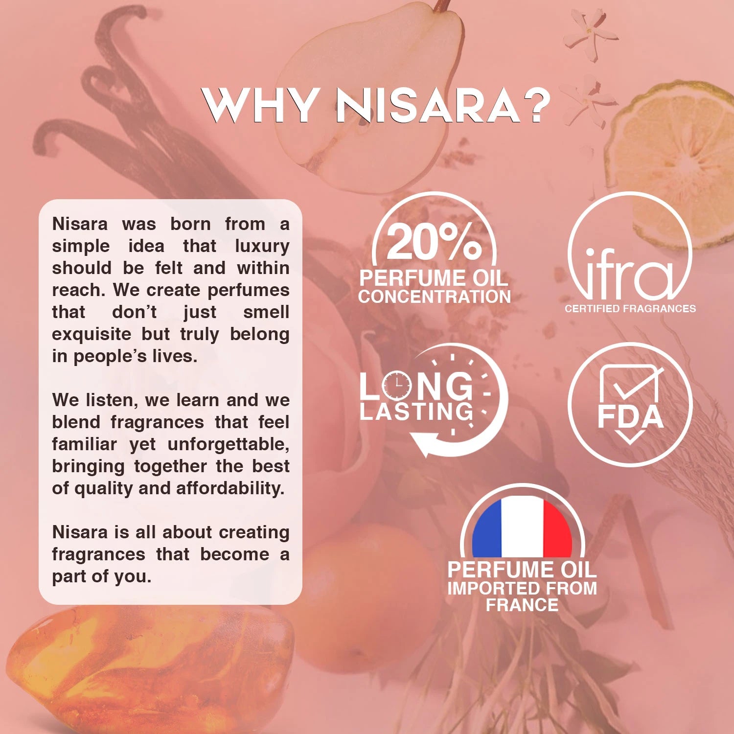 Miss Gorgeous by Nisara is a captivating women's perfume that embodies elegance, charm and vivacity. This fragrance offers a delightful blend of floral, fruity and green notes, making it the perfect scent for the modern, sophisticated woman. With an exquisite combination of bergamot, orange, pear, rose, freesia, cedarwood, musk, amber and vanilla, Miss Gorgeous creates a lasting impression of effortless beauty and grace.