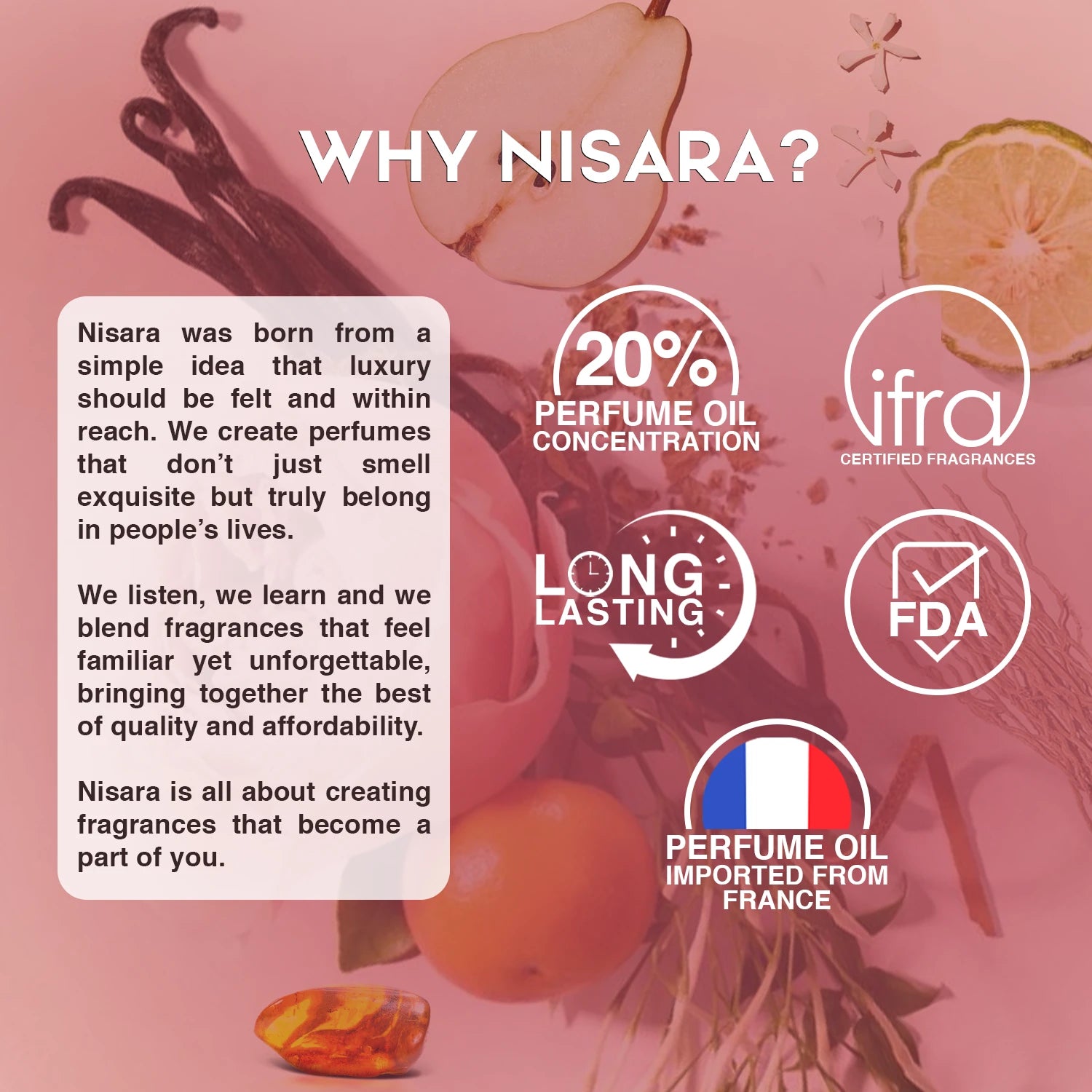Miss Gorgeous by Nisara is a captivating women's perfume that embodies elegance, charm and vivacity. This fragrance offers a delightful blend of floral, fruity and green notes, making it the perfect scent for the modern, sophisticated woman. With an exquisite combination of bergamot, orange, pear, rose, freesia, cedarwood, musk, amber and vanilla, Miss Gorgeous creates a lasting impression of effortless beauty and grace.
