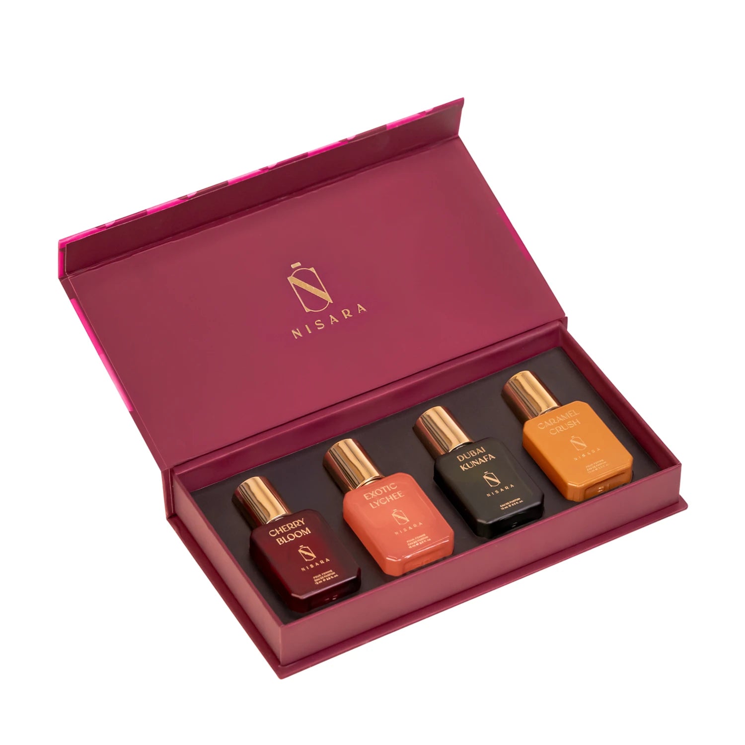 Nisara Perfumes proudly introduces an exclusive Gourmet Perfume Gift Set, a curated collection of four luxurious, high-quality women fragrances: Cherry bloom, Exotic lychee, Dubai kunafa & Caramel crush. These gift sets are the perfect way to indulge in the luxurious world of fragrances, providing an unparalleled scent experience for those who seek elegance and refinement.