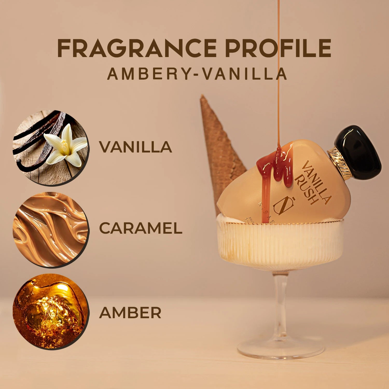 Vanilla perfume is a luxurious fragrance that exudes warmth, sweetness and sophistication. With a harmonious blend of orchid, white floral, caramel, tonka, amber, musk wood and patchouli, this perfume envelops the senses in a captivating embrace. Perfect for those who appreciate indulgent and memorable scents, Vanilla Rush promises to leave a lasting impression with its rich and complex aroma.