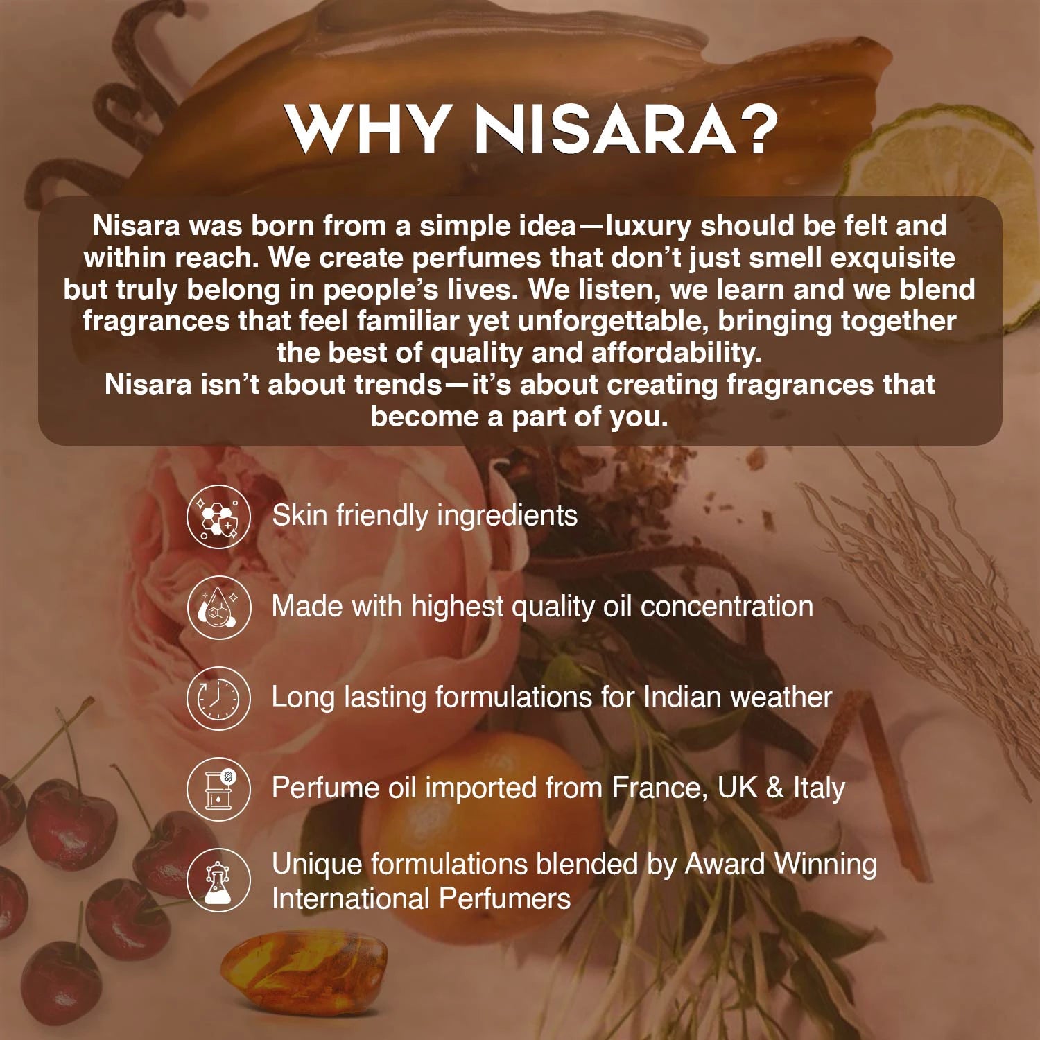 Caramel Crush by Nisara is more than a fragrance, it’s an irresistible invitation to embrace your desires and indulge in the sweetness of life. For the woman who isn’t afraid to be bold, sensual and unapologetically herself, this is your signature scent.